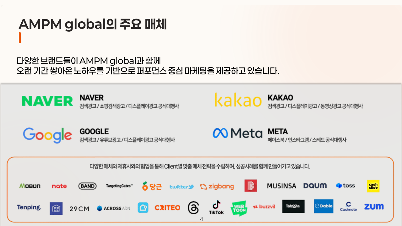 • 4. 에이엠피엠글로벌(AMPM global)은 매체사의 시스템 및 서비스장애로 인해 발생된 모든 장애에 대해 책임을 지지 않습니다.