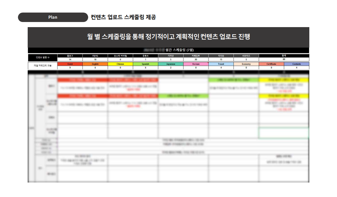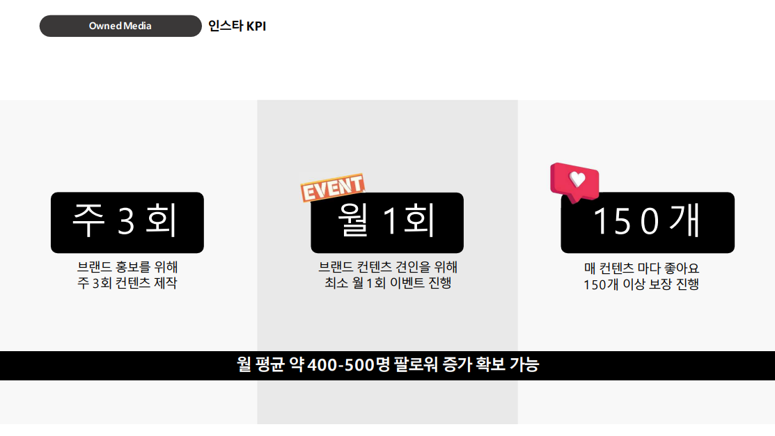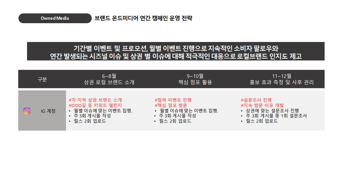 기간별 이벤트 및 프로모션, 월별 이벤트 진행으로 지속적인 소비자 팔로우와 연간 발생되는 시즈널 이슈 및 상권 별 이슈에 대해 적극적인 대응으로 로컬 브랜드 인지도 제고